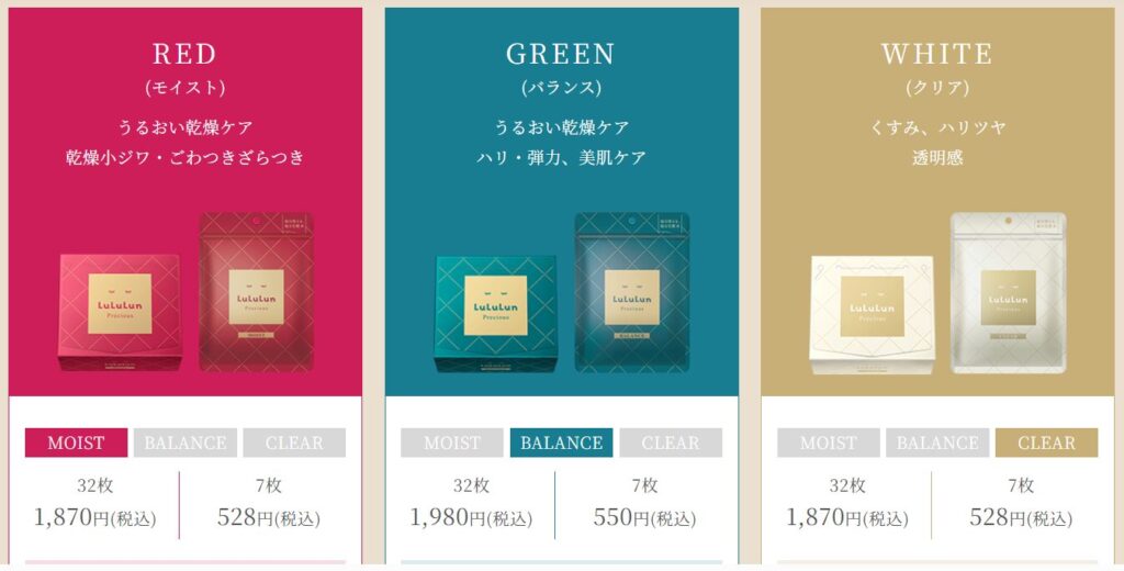 乾燥が気になる方や「最近ハリがなくなったかも…」という30代のお肌には、ルルルン プレシャス(赤・緑・白)シリーズがおすすめ。